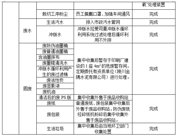 長治市票證印刷廠票證印刷項目,位于長治市城西北路55號國稅大廈院內,主要產品為卷式發票、平推式發票、手工發票、門票、信封、書刊的印刷。2018年12月委托中農康大生態環境科技有限公司編制完成環評文件,2019年1月31日長治高新區行政審批局以長高行審函[2019] 4號文對該項目予以批復。 根據環評文件及其批復要求,項目配套環保措施已于2019年6月建設完成,具體環保措施見表1: